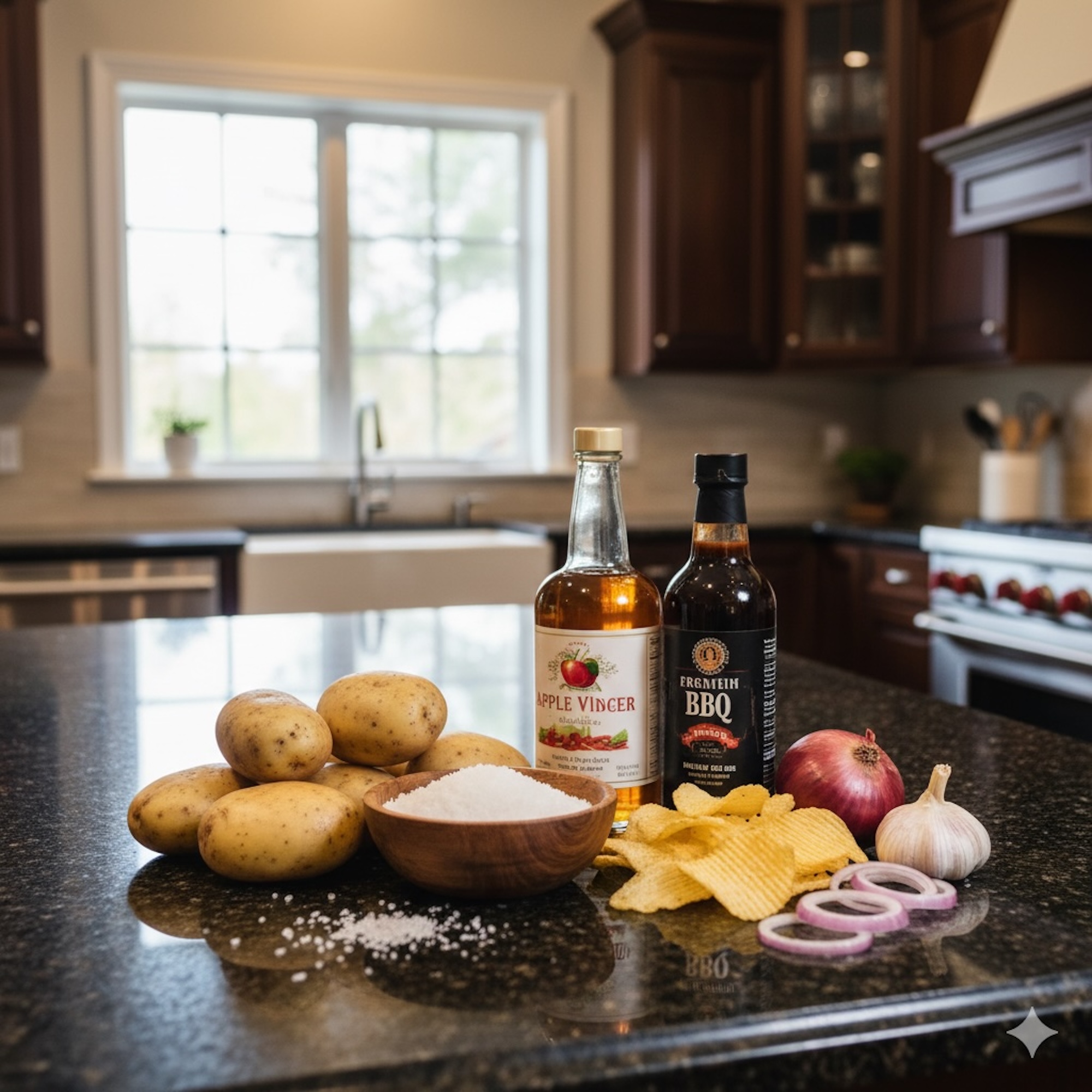 Zutaten: Kartoffeln, Pflanzenöle: Mais und/oder Sonnenblume; Speisesalz, Gewürze, Zucker, Säureregulatoren: Natriumacetate; Mais-Maltodextrin, Salz, Geschmacks- und Aromaverstärker: Natrium-L-Glutamat, Natriuminosinat; Hefeextrakt, Zwiebelpulver, Farbstoff: Paprikaextrakt, natürliches Raucharoma, Speisesalz, Farbstoff: Gelb.
